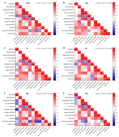Correlation pattern for investigated pollutants COD (A), TSS (B), total P (C), dissolved P (D), NO3 (E) and NH4 (F) with level of significance * = p ≤ 0.05, ** = p ≤ 0.01 and *** = p ≤ 0.001. Red squares indicating a positive, blue squares indicating a negative correlation coefficient.