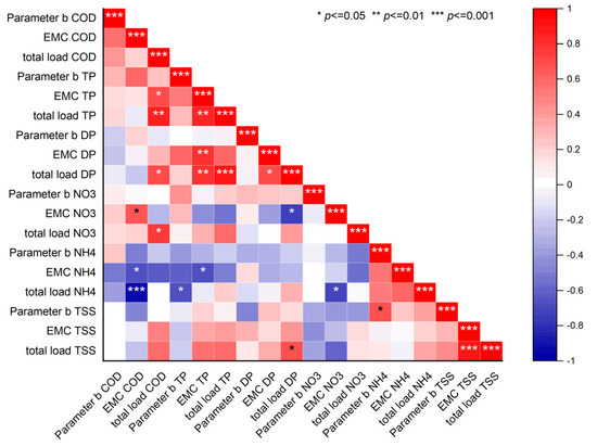 Correlation pattern for investigated pollutants with parameter b, pollutant EMCs and total pollutant loads with level of significance * = p ≤ 0.05, ** = p ≤ 0.01 and *** = p ≤ 0.001. Red squares indicating a positive, blue squares indicating a negative correlation coefficient, respectively.