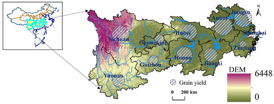 Spatial distribution characteristics of DEM in the Yangtze River basin. Notes: Grain yield refers to the total amount of grain produced in the calendar year of agricultural producers and operators. Grain yield is categorized by harvest season, including summer harvest, early rice, and autumn harvest; and by crop variety, including cereals, potatoes, and legumes.