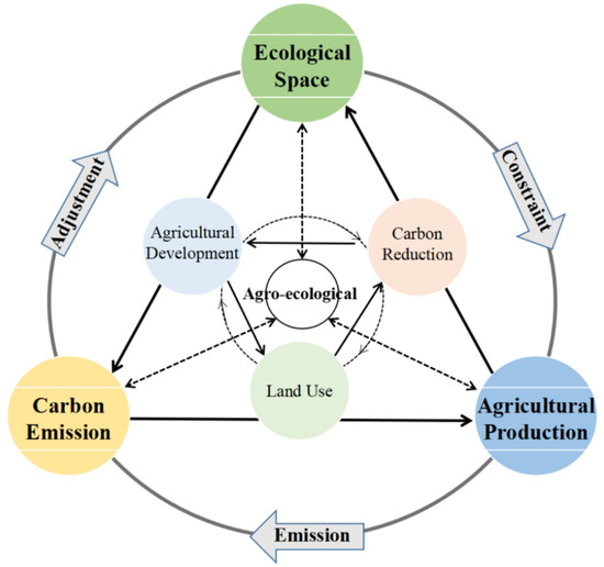 Against the background of the greenhouse effect, how to quantify the impact of the resource base of agricultural land on agricultural production? Referring to the human-activity–geographical–environmental regional system [13], this paper extends that the factors that affect the agricultural land eco-efficiency are rooted in the interrelated and feedback processes of the various factors that constitute the system, and that the interaction of various factors in different dimensions and levels forms the hierarchical structure of the key factors of agricultural land efficiency. Among all the links, agricultural land eco-efficiency plays a central role, accompanying agricultural development, agricultural land use, and low-carbon agricultural development, and can directly interact with ecological space, agricultural production, and carbon emission. Moreover, the relationships among ecological space, agricultural production, and agricultural carbon emission are interconnected and influence each other in both directions, i.e., ecological space–agricultural production, ecological space–carbon emission, and agricultural production–carbon emission. The positive interaction of resource–economy–environment development presents the process of “strengthening–restriction–promotion”, and its reverse interaction shows the process of “weakening–promoting–consuming”. As can be seen, there is also an interaction level and a dual relationship between each factor and every other factor in an internal city. The interaction of different factors and the dual relationship between them are the main factors that affect the agricultural land eco-efficiency.