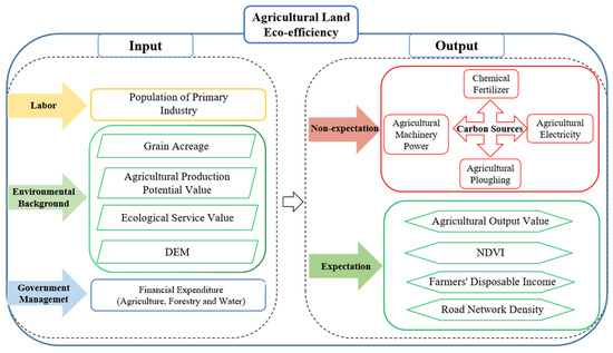 The rational use of land resources relying solely on agricultural land efficiency indicators that characterize the output capacity per unit area of land can no longer meet the requirements of environmental sustainability, which is a matter of public concern today [1,2]. In agricultural production activities, people harvest agricultural resource outputs. However, agriculture is an unignorable and important source of greenhouse gas emissions, which means that they are also suffering from ecological pressures, such as global warming, caused by agricultural land use [3]. Following this logic, agricultural land is the major input element of China’s agricultural production activities [4], and its eco-efficiency is not only related to China’s agricultural economy and food security, but also closely related to national ecological security.