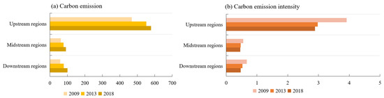 In addition, the total carbon emissions and the carbon emission intensity in the Yangtze River basin vary greatly. The river basin with the largest carbon emission is near the upstream cities (Figure 4a); simultaneously, the cities in this basin have the largest decrease in carbon emission intensity of 26.35% (Figure 4b). This could be attributed to the rapid development of the agricultural economy but backward agricultural production technology in these provinces, which failed to realize the effective development of low-carbon agriculture [43,44,45,46].