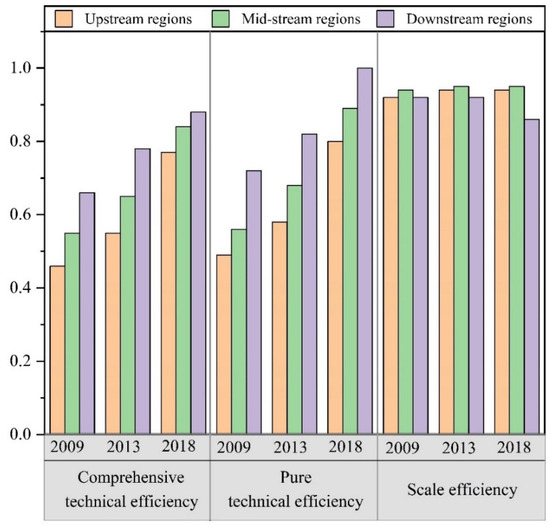 Figure 5 illustrates the temporal trends of comprehensive technical efficiency, pure technical efficiency, and scale efficiency of agricultural production in each region of the Yangtze River basin. Overall, the agricultural land eco-efficiency of the 11 provinces (cities) in the Yangtze River basin showed a fluctuating upward trend from 2009 to 2018, and the average carbon emission performance in each year is basically more than 0.5, which shows that great achievements have been made in the development of economic and agricultural production in the Yangtze River basin. However, there is still much room for improvement. From the perspective of timescale, the improvement of agricultural land efficiency in the Yangtze River basin is most obvious from 2013 to 2018, reaching a peak of 0.83 in 2018. This could indicate that the governments of the prefecture-level cities in the Yangtze River basin attach importance to modern agricultural production and are determined to save energy and reduce emissions, through a series of measures to significantly improve the eco-efficiency of agricultural land. From the spatial scale, the downstream cities are in the leading position with higher agricultural land eco-efficiency. This may be attributed to the superior geographical location, higher level of economic development, and stronger environmental awareness of the downstream basin cities, which have improved the efficiency of agricultural resource use through the introduction of advanced technologies. However, the cities in the midstream and upstream basins are under great pressure to maintain the coordinated regional development of low-carbon agriculture, despite the abundant natural resources [47,48].