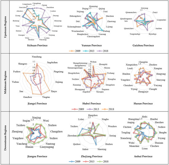 Figure 6 illustrates the agricultural land eco-efficiency of cities in nine provinces located in the upstream, midstream, and downstream of the Yangtze River. On the temporal scale, the eco-efficiency of agricultural land in most cities in the Yangtze River basin is increasing, but in some cities it still has a decreasing trend, mainly concentrated in the midstream and upstream regions, which may be due to the fact that these regions still rely on the crude agricultural production model in exchange for agricultural economic development, and in addition, the large number of laborers moving to cities for employment also directly leads to the decrease of agricultural land utilization efficiency. On the spatial scale, the urban areas with the highest eco-efficiency of agricultural land are mainly distributed in Zhejiang and Jiangsu, while the low eco-efficiency of agricultural land is mainly distributed in Guizhou, Yunnan, and other cities. In each city area of the Yangtze River basin, the highest value of agricultural land efficiency is Zhoushan City, which reaches 1.48; the lowest value of agricultural land efficiency is Zunyi City, which is only 0.176. The difference of agricultural land efficiency between the two cities is 1.3. The imbalance of agricultural production development between cities is prominent. Combined with the evaluation system in this paper, such a phenomenon may be attributed to upstream cities’ transportation limits, ecological fragility, and backward agricultural technology, while downstream cities have sufficient capital and technology capacity as support.