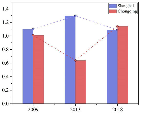 In view of the fact that Shanghai and Chongqing are municipalities directly under the Central Government of China, Shanghai has a special status compared with other cities (Figure 7). From 2009 to 2018, the utilization of agricultural land ecological resources in Shanghai and Chongqing are very different. The efficiency of agricultural land resources in Shanghai is higher than that in Chongqing, but the evolution law of these two cities shows an obviously opposite trend. The efficiency of agricultural land resources in Shanghai shows an “inverted U” trend, while Chongqing shows a “U” shape. In addition, the eco-efficiency of agricultural land in Shanghai is always higher than the highest value in Chongqing.