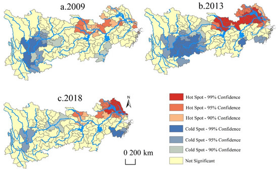 Hotspot analysis uses the z-value of the Getis-Ord Gi statistic (the higher the z-value, the redder the color, indicating that the attribute is a spatial hotspot; the lower the z-value, the bluer the color, indicating that the attribute is a spatial coldspot) to identify the aggregation effect of high and low values of spatial location, i.e., to explore the spatial distribution characteristics of hotspot and coldspot areas of agricultural land eco-efficiency in the Yangtze River basin [40,41,42]. Compared to the global Moran’I statistic, the hotspot analysis method can correctly reveal spatial independence.