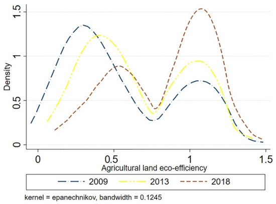STATA was used to estimate the kernel density of agricultural land eco-efficiency for the cities in the Yangtze River basin in 2009, 2013, and 2018, with the aim of revealing the evolutionary characteristics of the distribution of agricultural land eco-efficiency. The results are shown in Figure 9.