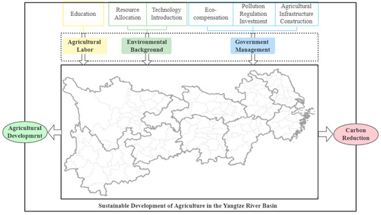 As shown in Figure 10. According to the previous calculation results, we have put forward reasonable suggestions for the agricultural development of the Yangtze River economic belt in the future. First of all, we have defined the orientation of agricultural development; that is, we have established the two major goals of agricultural development. One is to ensure the sustainable development of agriculture, and the other is to help China’s dual-carbon target (reaching a carbon peak in 2030 and carbon-neutral in 2060) [50,51]. To achieve the goal of coordinated development of agricultural economy and eco-environment, decision makers in each prefecture-level city in the Yangtze River basin should adopt a “site-specific” rather than a “one-size-fits-all” strategy for agricultural development [52]. Within the United Nations 2030 Sustainable Development Goals, a long-term strategy of agricultural production supported by “ecological space–agricultural production–carbon emission” should be explored and promoted to achieve high-quality development of regional agriculture [53].