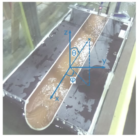 Figure 2. Laboratory setup of the open channel used for the experiments. Different camera positions are described with angles ϕ and θ in relation to the channel geometry. The depicted channel has a length of 1370 mm, and the half pipe has a radius of 100 mm. - P2: Above and in front of the channel (0° < θ < 90° and ϕ = 0°, according to Figure 2)
