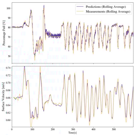 Water Level and Surface Velocity Measurements and Predictions Using the CNN of Scenario 1. Both the measurements as well as the predictions are smoothed using a rolling average.