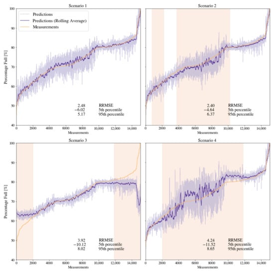 The summarised results for each of the four scenarios can be seen in Figure 4. Below each scenario, the mean relative root squared error, as well as the 5th and 95th percentiles of the prediction error indicate the prediction performance. These quantile ranges demonstrate the uncertainty associated with a single prediction—smaller ranges are thus preferred. The shaded area visualises the gaps in the data set, i.e., input that has never been seen by the network during training.