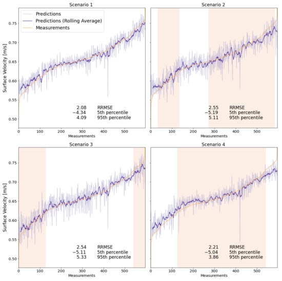 Surface velocity evaluation and relative errors for Scenario 1—base case, Scenario 2—two gaps, Scenario 3—no extreme values, and Scenario 4—only extreme values. Shaded areas represent missing training data, i.e., surface velocities that were never observed during training and need to be fully interpolated by the network. Underneath each scenario, the predictor performance is summarized with the error band of [5th percentile error, relative root mean squared error, 95th percentile error].