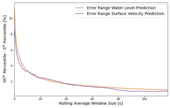 The accuracy of the surface velocity measurements under optimal conditions are comparable to existing large-scale particle image velocimetry (LSPIV) approaches, such as [20], who have an error of 1.7% compared to their reference sensors. As explained earlier, missing training data is the main problem of the presented approach, resulting in uncertainties when unseen situations are evaluated. PIV approaches have the benefit that they require only an initial calibration of the camera parameters to counteract image distortions before being operational—in every situation, as long as enough trackable particles are available. As both techniques rely on image material, both approaches have excellent cross-usage potential, as well as the possibility for manual plausibility checks.