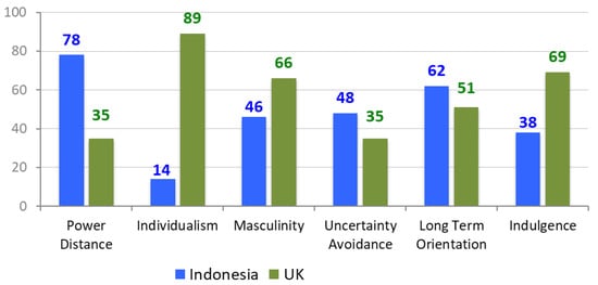 Comparison of Indonesia and UK culture across 6 dimensions (recreated from [] in 2021).