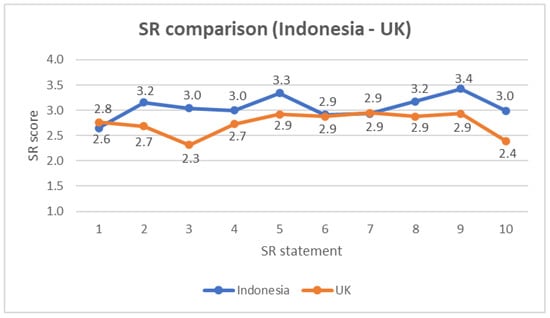 Figure 4 depicts a profile of mean SR scores compared between the aggregated responses of Indonesian and UK communities. It appears that SR scores of Indonesian communities are higher (significant at 1% level) in most statements with the exception of Statements 1, 6, and 7. The comparison of SR scores for Statement 1 seems to be consistent with the UAI score comparison between Indonesia and the UK from Hofstede Insights in Figure 1 [] in that Indonesian communities tend to have higher UAI, reflected in a lower SR score for that statement (although it is not significant). No significant differences were observed between SR scores from Indonesian and UK communities in Statements 6 and 7. In the case of most statements (2, 3, 4, 5, 8, 9, and 10), the significantly higher SR scores relevant to the IDV dimension indicate that Indonesian communities demonstrate a tendency to place greater importance on their association to their communities rather than UK communities do.