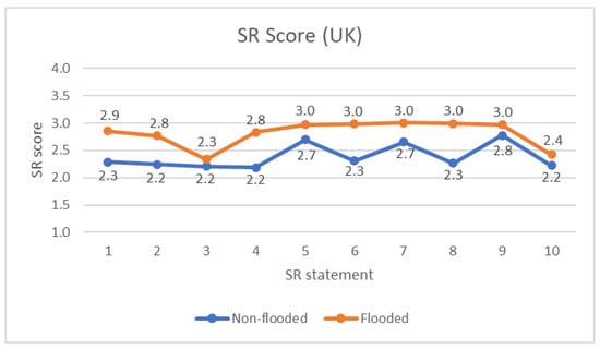 Figure 5 shows a profile of mean SR score comparisons between aggregated responses of flooded and non-flooded communities in the UK. Statistical test results presented in Table 5 suggest that the differences of SR scores are significant in all statements but Statement 3. The significant difference of SR scores regarding Statements 1 and 10 suggests that UK flooded communities are much more concerned about flooding and climate change than non-flooded communities. Based on a national survey in the UK, Spence et al. [] found that individuals with experience of flooding expressed more concern on climate change and willingness to take action. Significant differences of SR scores for Statements 2, 4, 5, 6, and 9 suggest that flooded communities recognise the role of community more strongly than non-flooded communities do. Similarly, Statements 7 and 8 suggest that flooded communities have a greater tendency to take care of their responsibility to others than non-flooded communities. The results in Figure 5 highlight the critical role of flooding experience on elevating the importance of community, shaping the perception of flooding, and acting on climate change. Previous studies indicate that experience of flooding is an important factor influencing risk awareness, response, and preparedness (e.g., [,,]), which, in turn, can impact on the perceptions of SR.
