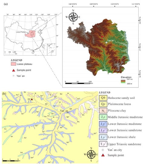 Figure 1. (a) Location of study area; (b) Associated geological map of the sample point (Geological map is modified based on Geological Map of China).