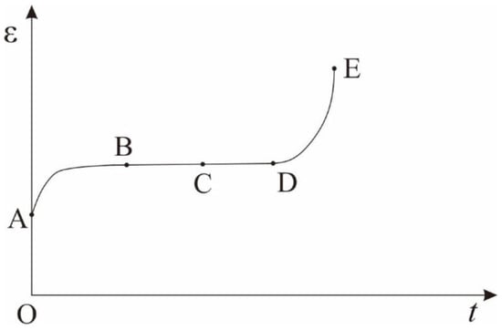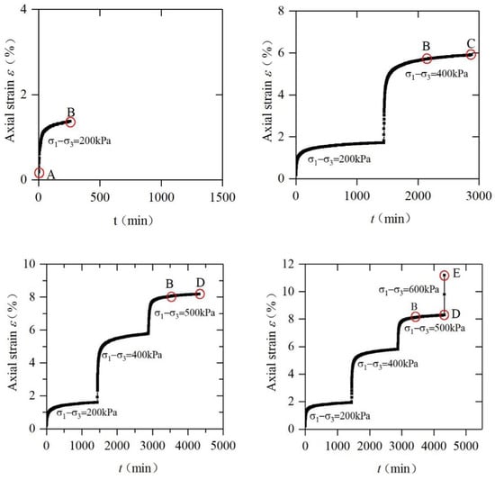 Figure 2 shows a typical creep curve. The vertical axis is the strain. Section OA is the instantaneous strain phase, section AB is the decay creep phase, section BD is the steady creep phase and section DE is the accelerated creep phase. At the moment of loading, the loess produced instantaneous strain. When the deviator stress was low, the creep rate gradually decreased; this stage is called the decay creep phase. When the deviator stress was high, the creep rate remained constant after experiencing the decay creep phase; this stage is called steady creep phase. When the deviator stress reached a certain value, after experiencing decay creep phase and steady creep phase, the creep rate increased with time; this stage is the accelerated creep phase. The loess was located at the end of the stable creep (point D in Figure 2) and just before the accelerated creep. When the axial strain of the loess reached 10% of its height, this indicated that the sample had been destroyed.