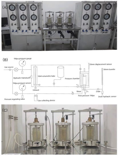 Figure 3. (A) FSR-20 unsaturated soil triaxial creep apparatus; (B) schematic diagram of creep apparatus; (C) creep experiment.