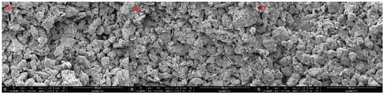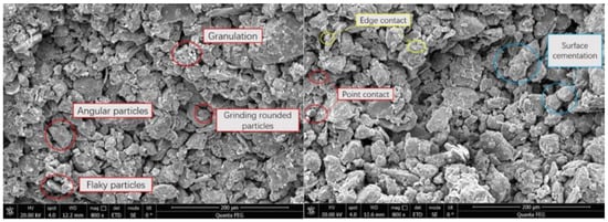 Figure 6 and Figure 7 show the SEM photos of intact and remolded samples at different creep stages. The analysis of the photos shows that in the triaxial creep test, the structure of the intact samples gradually became compact, the clastic and clay materials on the surface of the particles increased, the soil particles gradually changed from mainly granular and massive to mainly agglomerated, the overhead pores in the soil pores decreased and the intergranular pores increased. Due to the loose structure of the intact loess, the soil particles gradually aggregated into larger aggregates under the action of external loads, and the soil became an agglomerated structure. Under confining pressure and deviator stress, the large pores collapsed and the tiny pores and micropores increased, presenting axial compression and volume compression at a macro level. Due to the complete disturbance of the remolded loess, the initial orientation of the soil particles was poor. Under confining pressure and deviator stress, the direction of the soil particles gradually deviated to deviator stress, so the qualitative development of remolded loess was more obvious than that of the intact loess during the creep process. Comparing the SEM images of the two types of samples after destruction, it can be seen that the remodeled sample presented significantly more fine particles than the intact sample, since the remodeled loess featured a larger initial dry density than the intact loess, resulting in a more significant degree of slip misalignment between the soil particles at the later stage of creep, which subsequently led to a significant increase in fine particles.