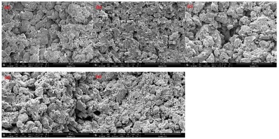 Figure 7. SEM photographs of remolded loess specimens at different creep stages: (a) before test; (b) decay creep; (c) steady creep; (d) before creep test; (e) after creep test.