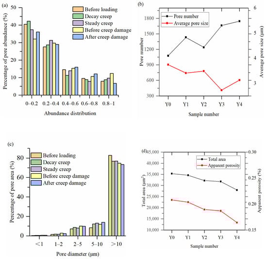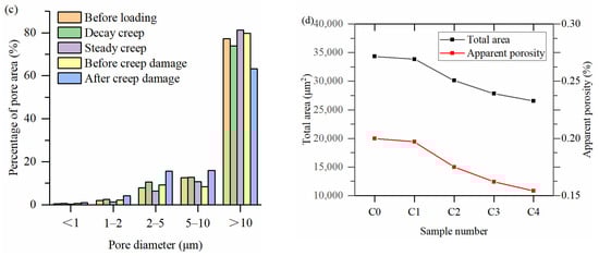 Figure 8c,d shows the pore area analysis results of intact loess in different creep stages. With the increase in the deviator stress, the proportions of pore area more significant than 10 μm decreased, while the proportions of the other pores increased. As the number of pores increased, the total pore area and apparent porosity showed a decreasing trend. The reason for this phenomenon is that under deviator stress, the extrusion between soil particles led to the collapse of the loess skeleton, making the intergranular pores continuously filled and migrated, as well as the gradual change from large pores to tiny pores.