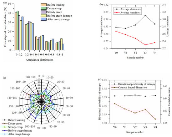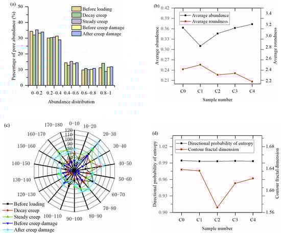 Figure 12a shows that the abundance of pores in the intact loess was mainly distributed between 0 and 0.6, where the pores with the abundance between 0 and 0.4 were dominant. With the increase in the deviator stress, the pores with an abundance between 0 and 0.6 slightly decreased, while the pores with an abundance between the 0.6 and 1 slightly increased. The average value first tended to decrease with the increase in the deviator stress and then tended to increase. This shows that the number of round pores increased slightly with the increase in deviator stress. This was because after the compaction of the remodeled loess, the particles were uniformly distributed and the inter-particle reached a relatively stable state, so its abundance changed little under the external load. Figure 12b analyzes the roundness of the pores of the remodeled loess at different creep stages. It can be seen that the value shows an overall decreasing trend with the increase in the deviator stress, which indicates that the pore structure tended to gradually round and the loess structure tended to gradually stabilize.