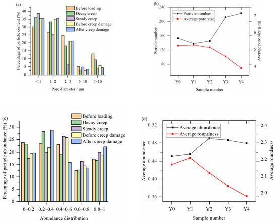 Figure 10a shows the particle pore size analysis results of the intact loess in different creep stages. The results show that the diameter of the soil particles was mainly distributed in the range of 0–5 μm, accounting for about 80%. With the increase in deviator stress, the number of particles tended to increase and the overall pore size tended to decrease. This was due to the “slip” between soil particles under external load, increasing the number of fine particles and, consequently, the number of particles, as well as decreasing the pore size.