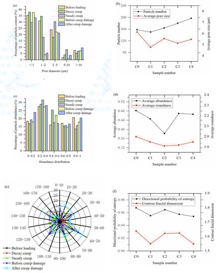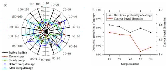 The frequency of the orientation distribution of the intact loess particles is shown in Figure 10e. Analyzing the data in the figure, it can be concluded that the intact loess particles were dominant in the 30–80° range and showed some orientation. The loess samples after creep damage were dominant at 130–140°, 150–160°, with an overall increase in directionality. Figure 10f analyzes the directional probability of the entropy of the intact soil particles at different creep stages. It can be seen that the value shows an unstable decreasing trend with the increase in the deviator stress. However, the decrease is insignificant, coinciding with the directional distribution frequency. Figure 10f shows the fractal dimension of the particle profile of the intact loess at different creep stages. It can be seen that the value shows an overall decreasing trend with the increase in the deviator stress during creep, indicating that the particle profile gradually rounded and that the soil structure gradually stabilized.