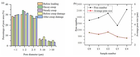 Figure 8a,b shows the pore size analysis results of intact loess in different creep stages. The pores with a size of less than 5 μm account for a large proportion in each creep stage and the pores with a pore sizes of 1–2 μm and 2–5 μm account for more than 55%. With the increase in deviator stress, the proportion of pores less than 1 μm and 1–2 μm gradually increased and the proportion of pores larger than 2 μm gradually decreased. Compared with the average pore size of the initial pore of the intact loess, the pore size decreased with the increase in deviator stress. The reason for this is that the soil particles gradually clustered under the load, the inter-particle spacing decreased, some of the large pores collapsed to form tiny pores and the pore diameter decreased.