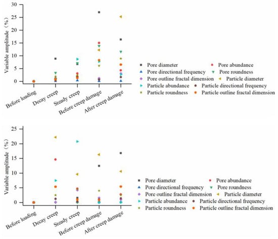 During the creep process, the loess microstructure changed correspondingly under deviator stress, but different microstructure parameters featured different trends. Figure 14 shows the changes in the microstructure parameters of the intact and remolded loess at different creep stages. The average pore size and particle size changed significantly at different creep stages for intact loess. The average variation range of the pore sizes was 14.70%, followed by particle size and porosity roundness, which were 10.09% and 8.99%, respectively. The probability of pore and particle orientation was the lowest, at 0.145% and 1.14%, respectively, indicating no obvious orientation in the creep process. The other parameters, porosity abundance, fractal dimension of pore profile, particle abundance, particle roundness and fractal dimension of particle profile, were 5.89%, 1.79%, 5.04%, 4.79% and 4.22%, respectively. For the remolded loess, the average particle size and average pore size changed significantly at different creep stages. The average particle size and pore size changed significantly at different creep stages for the remolded loess. The average variation range of the particle size was the largest, 14.68%, followed by pore size, which was 9.03%. The probability of pore and particle orientation was the lowest, at 0.118% and 1.00% respectively, indicating that there was no obvious orientation in the creep process. The other parameters, porosity abundance, porosity roundness, the fractal dimension of pore profile, particle abundance, particle roundness and fractal dimension of particle profile, were 5.58%, 4.87%, 1.71%, 7.07%, 3.38% and 3.16%, respectively.