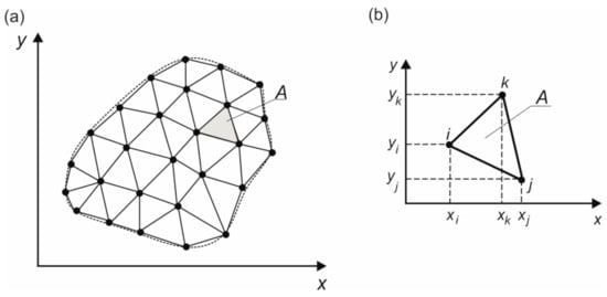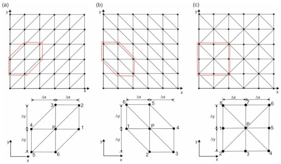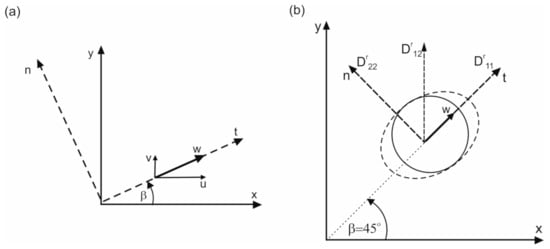 As a result of the rotation (Equation (41)), the non-zero values of the tensor components are to be found only on the main diagonal, i.e., in the tangential (t) and perpendicular (n) directions to the flow direction. The same procedure was used to derive the numerical diffusivity and dispersivity tensors for the remaining mesh structures of triangular elements presented in