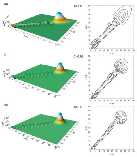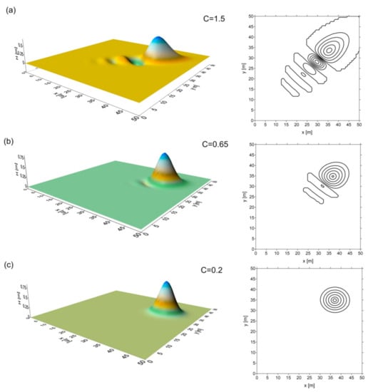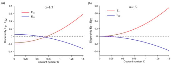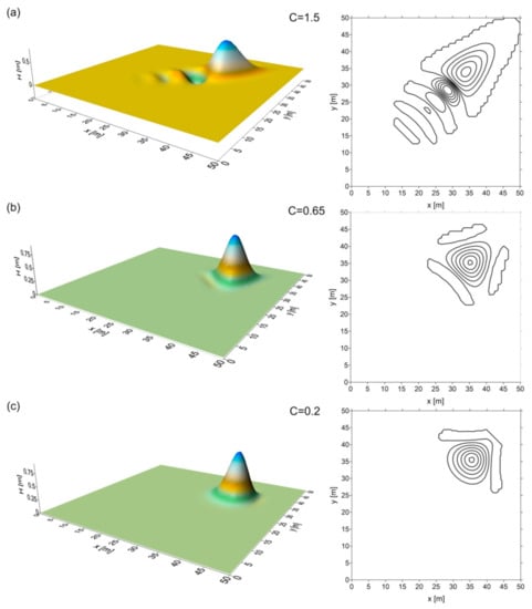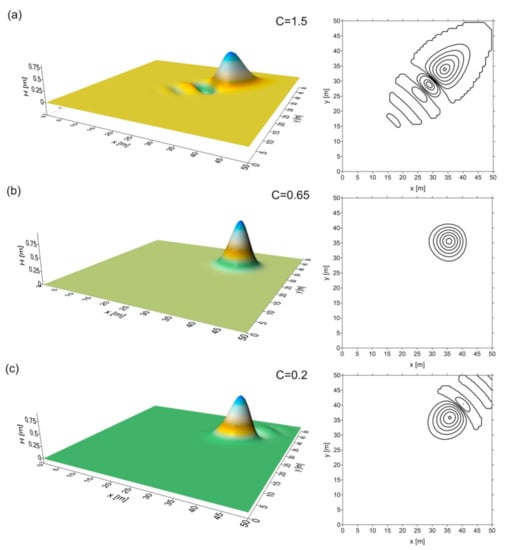 Figure 4b), the dispersion error will converge to zero with decreasing values of the Courant number. Thus, by assuming low values of this number, it is also possible to significantly minimize the dispersion error. However, in this case, with a fixed value of the space interval Δ
