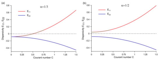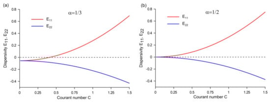 E22 simultaneously have the smallest absolute values, consequently, also the dispersion error should be minimized. On the other hand, assuming values of the Courant number outside the range [0.58, 0.71], one should expect significant errors that will cause non-physical oscillations in the obtained solution.