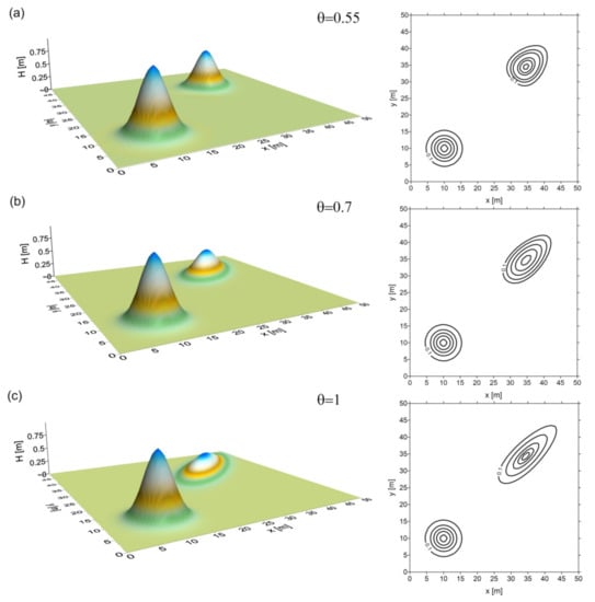 As can be seen, for all mesh structures, the diffusion tensors Dr take the same form (Equations (42), (44), and (46)). Since the component D11 of the tensor Dr for θ > 1/2 is a non-zero value, whereas the other components are equal to zero, then the applied scheme generates numerical diffusion only in the tangential direction. On the other hand, depending on the mesh structure, the dispersivity tensors Er have different components lying on the main diagonal. Thus, although meshes with the same triangular elements were used, the various orientations of triangular elements lead to schemes with different numerical properties.