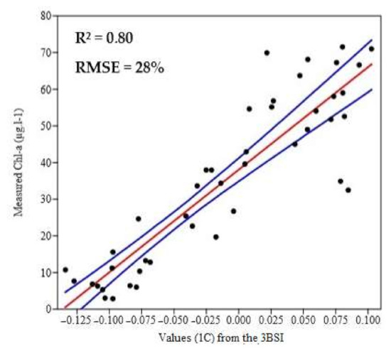 Relationship between the measured in situ chl-a, for the samples considered in the calibration dataset, and the values generated by the three-band spectral index (3BSI) for the Sentinel-2 Level 1-C image datasets. The red line represents the regression model calculated using the bootstrap resampling technique. Blue lines indicate two RMSE estimates of chl-a.