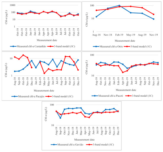 The independent validation dataset was collected from August 2018 to December 2019. The estimated chl-a concentrations were compared to the observed chl-a concentrations (Figure 3). The correlation between the validation data, considering the 5 reservoirs, presented a coefficient of determination R2 = 0.77. Overall, the retrieved chl-a concentration followed well the temporal behavior of the field data except for the Pacajus reservoir, which presented the lowest chl-a concentration levels observed.