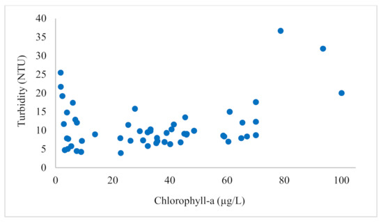 Chlorophyll-a concentration vs. turbidity of samples collected in situ for validation data, in all reservoirs of this study. Determination coefficient for linear relationship (R2) < 0.09. Chl-a and turbidity are practically independent, indicating these reservoirs belong to case 2 waters.