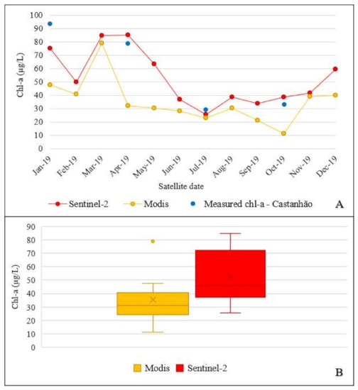 Figure 5B shows the distribution of both MODIS and Sentinel-2 derived chl-a data in a boxplot format. It is observed that the chl-a estimated by MODIS shows lower concentration values when compared to Sentinel-2 data. It is noteworthy that, in 2019, the Castanhão had its trophic status varying between hypereutrophic and eutrophic, as shown in Figure 6, which suggests a high chl-a concentration in that graph. In addition, Sentinel-2 has a greater range of concentration values throughout the year. That is more consistent with the field data collected in the reservoir, which showed greater chl-a concentration in the first months of the year, and a drop of concentration as the year goes by.