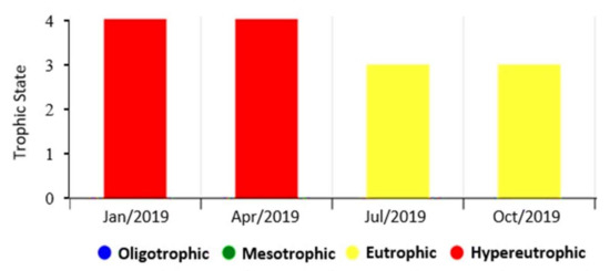 Trophic state of the Castanhão reservoir retrieved from quarterly measurements for the year 2019. Adapted from COGERH and made available at the electronic address http://www.hidro.ce.gov.br/hidro-ce-zend/acude/eutrofizacao (accessed on 17 January 2022). In 2019, no oligotrophic and mesotrophic conditions were found in the Castanhão as represented by the Trophic State Index (TSI): 1—Oligotrophic (24 ≤ TSI ≤ 44); 2—Mesotrophic (44 < TSI ≤ 54); 3—Eutrophic (54 < TSI ≤ 74); 4—Hypereutrophic (TSI > 74) [3].