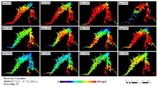 Figure 7 shows the time series of the chl-a maps, generated for the Castanhão reservoir for every month of 2019 and prepared from Level 1C products, using Equation (2).