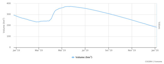 Variation in the daily water volume in the Castanhão reservoir during 2019. Release discharge: 7476 m3/s. Available by COGERH at the website http://www.hidro.ce.gov.br/hidro-ce-zend/acude/nivel-diario (accessed on 17 January 2022).