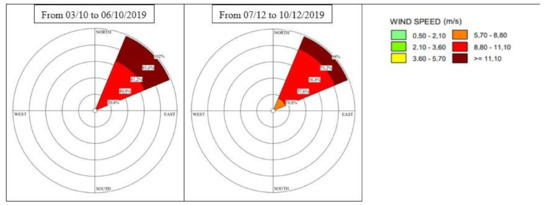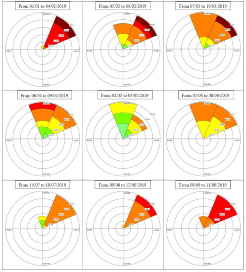 Compass rose containing wind speed (gust) and direction over the months of 2019. It was not possible to generate the graph for the month of November due to lack of data. The data were made available by INMET, on the portal https://portal.inmet.gov.br/ (accessed on 26 February 2020), and extracted from the conventional meteorological station Morada Nova/CE.
