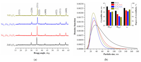 (a) X-ray diffraction patterns of the Ni-Zn ferrite powders; (b) crystallite size distribution of the obtained NixZn1-xFe2O4 (x = 0, 0.3, 0.7, 1.0) ferrites.