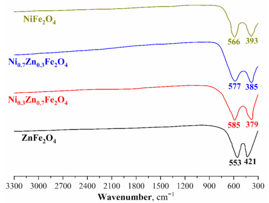 Ni-Zn ferrites’ IR-spectra of various compositions are shown in Figure 2. In all the samples examined, only two main absorption bands are observed in the range from 379 I kto 553 cm−1. The lack of absorption bands related to zinc, nickel, and iron crystalline hydrates should also be noted. Consequently, this indirectly confirms that all the starting materials have either reacted completely or were removed from the powders during heat treatment. Moreover, absorption bands varying from 379 to 553 cm−1 are characteristic of this class of compounds and additionally confirm the successful formation of nickel-zinc ferrites [56,58].