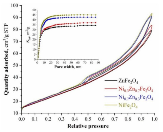 Low-temperature nitrogen adsorption-sorption isotherms of the nanostructured nickel-zinc ferrites.