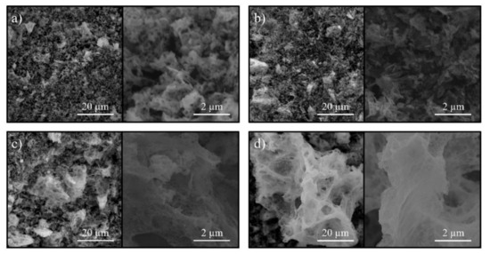 This variance is most likely associated with a change in the combustion temperature depending on the composition of the reaction medium and was considered in detail in previous works [12,44]. The outstanding is the spongy structure of the obtained ferrites, which plays an important role in the process of water sources purifying and can increase the sorption activity [62]. It should be noted that the morphology of all synthesized samples corresponds to typical products of solution combustion obtained using glycine as an organic fuel [12,44,58].