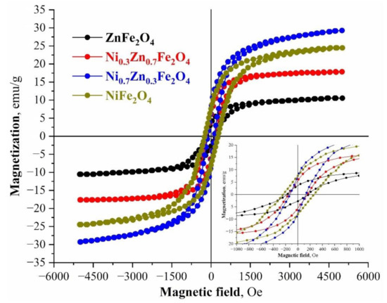 The magnetic nature of the synthesized compositions represents a typical ferrimagnetic behavior model. From the point of magnetic characteristics and the process of magnetic separation of ferrite nanoparticles from aqueous solutions, the most promising samples are NiFe2O4 и Ni0.7Zn0.3Fe2O4, which characterize the most prominent parameters of remanent magnetization and saturation magnetization (Mr = 7.62 and 7.31 emu/g, Ms = 29.34 and 24.57 emu/g). Conversely, from the point of the coercive force and, as a consequence, the ability of ferrite to react to an external magnetic field and to be magnetized, the most propitious are NiFe2O4 and ZnFe2O4 (Hc = 230.7 and 180.4 Oe) (Figure 5). The fact that both in the average crystallite sizes and the values of specific surfaces, the magnetic parameters (except for the coercive force) change linearly with an increase of the amount of the Ni2+ cations in the spinel structure, is of particular note. This is also related to the structural changes in the synthesized compositions. It is known that the magnetic properties of ferrites are greatly influenced by the average particle size, which significantly changes within the synthesized series [63,64].