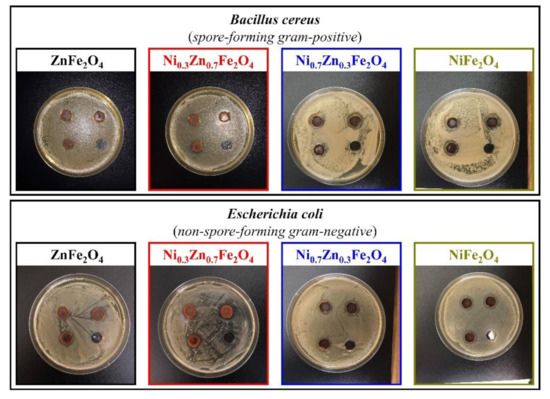Inhibition zone assay of the obtained NixZn1-xFe2O4 (x = 0, 0.3, 0.7, 1.0) ferrites toward B. cereus and E. coli.