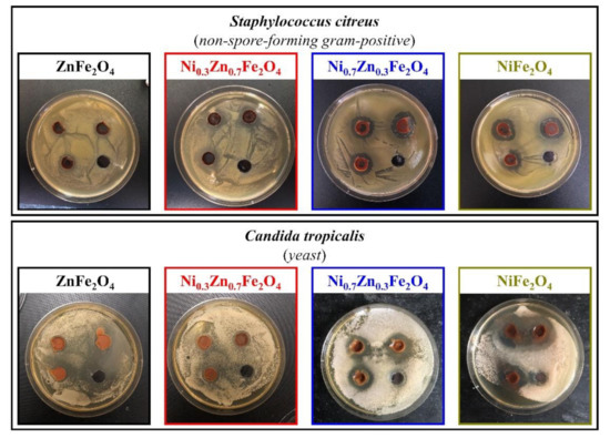 Inhibition zone assay of the obtained NixZn1-xFe2O4 (x = 0, 0.3, 0.7, 1.0) ferrites toward S. citreus and C. tropicalis.
